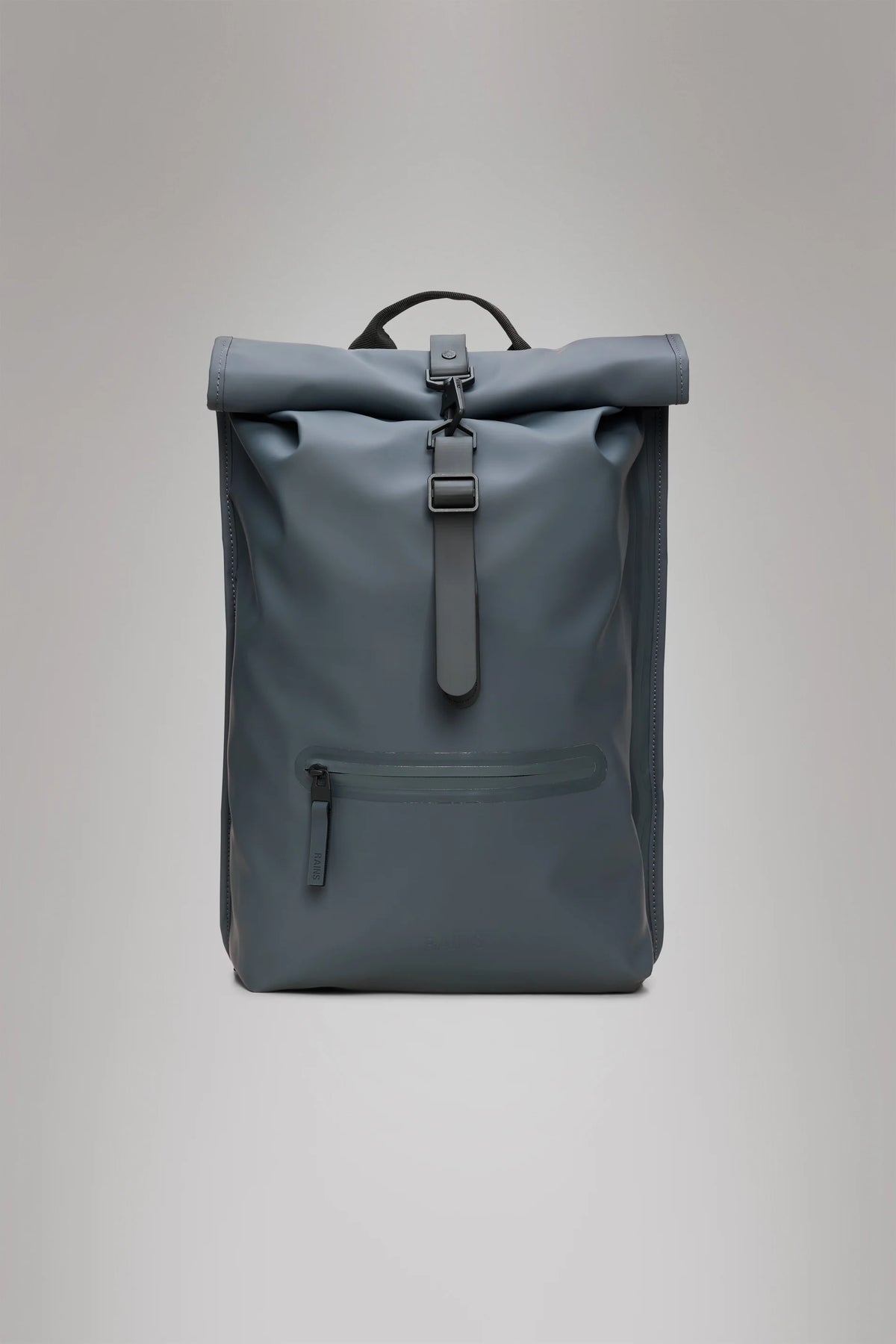 Rolltop Rucksack is cut in Rains’ signature waterproof PU fabric, engineered for carrying strength, durability, and a smooth feel.
