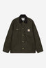 The Michigan Coat is constructed in our 12 oz organic and untreated cotton Dearborn Canvas, meaning that the style will soften with wear over time, creating a fit that is unique to the wearer. Inspired by a classic chore coat silhouette, the garment is cut in a regular fit and features a striped blanket lining for warmth. A corduroy collar and front patch pockets offer tactile touches, while triple-stitch details provide extra durability.